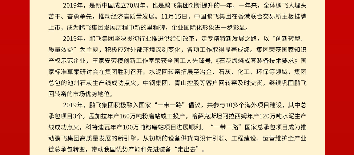 行者常至,為者常成。2020年是全面決勝小康社會和“十三五”規劃收官之年,是鵬飛集團再創佳績的關鍵之年。新的一年,我們將以習近平新時代中國特色社會主義思想為指引,全面貫徹黨的十九大和十九屆二中、三中、四中全會精神,團結一心、擔當作為,踐行新發展理念,堅持高質量發展,大力實施“科技化、國際化、資本化、品牌化”戰略,為建成回轉窯、粉磨設備制造與服務全球知名的企業集團,為裝備制造高質高效、節能環保及國際產能合作而努力奮斗!