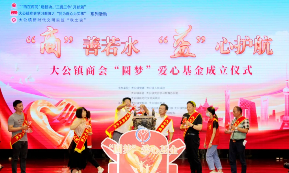 涓涓細流匯成大海,大公鎮商會會員企業家代表共同將愛心基金注入愛心池。緩緩騰起的煙霧,象征著企業蒸蒸日上的業績,更象征著青少年們騰起而飛的夢想!
