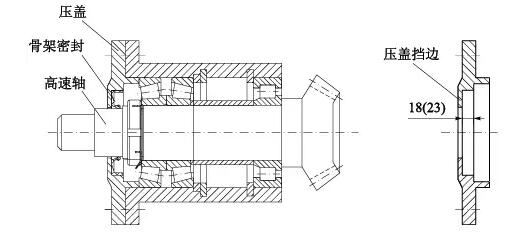 骨架密封厚度15mm,拆下壓蓋用車床將骨架密封擋邊車薄5mm,壓蓋密封槽深度由18mm加深到23mm(見圖4)。此法使得骨架密封在高速軸上的安裝位置向外移動5mm,避開高速軸上的溝槽。經此處理,解決了漏油問題,可以正常生產,等到計劃檢修停機時,再徹底處理高速軸上的溝槽。