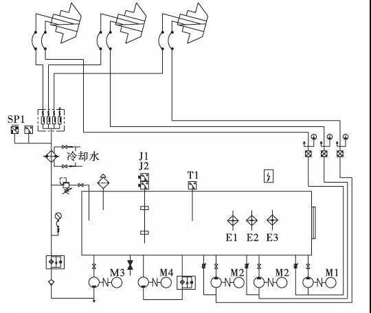 立磨潤滑系統原理如圖2所示,磨輥潤滑系統工作原理為:潤滑系統工作時,油液經供油泵從油箱抽出,經過濾器、冷卻器、分流器等進入磨輥內部,經循環潤滑換熱后,由回油泵從磨內強制抽出,送回油箱,潤滑系統通過循環往復實現磨輥的潤滑功能。單個磨輥供油泵分配流量為13 L/min,單輥配置一個能力為20 L/min的回油泵強制回油。